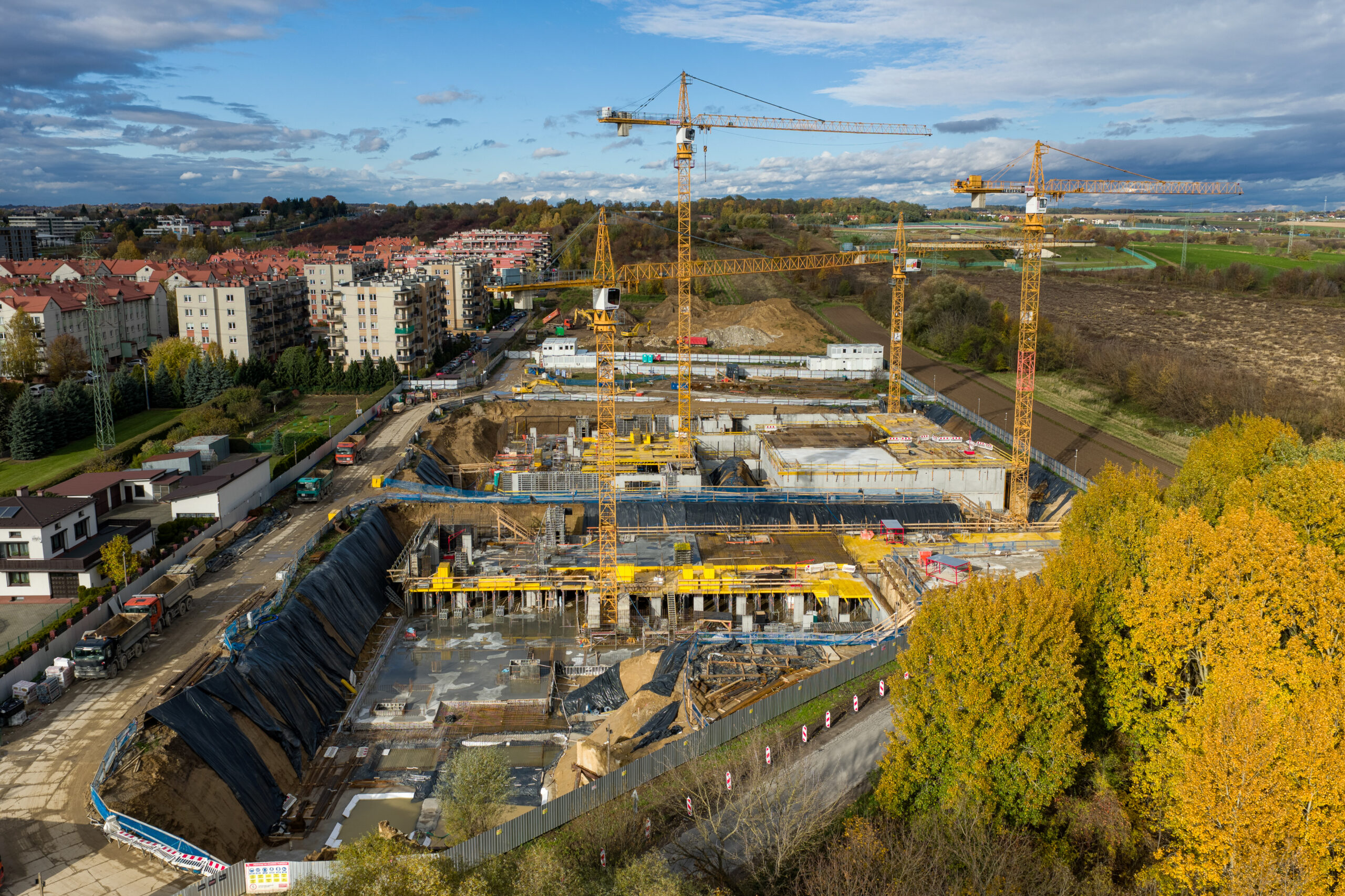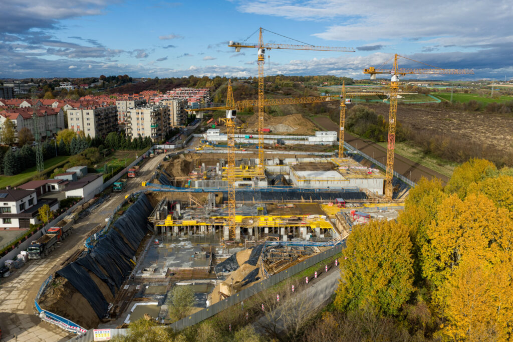 Kompleksowe wykonanie stanu surowego otwartego wraz z organizacją budowy, pracami ziemnymi, zabezpieczeniem wykopu, robotami murowymi i hydroizolacją TBW na budowie dwóch budynków mieszkalnych wielorodzinnych z dwukondygnacyjnymi garażami podziemnymi oraz infrastrukturą towarzyszącą przy ul. Ks. Józefa Meiera w Krakowie.